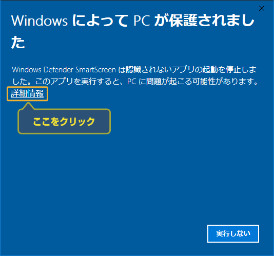 インストール時に「WindowsによってPCが保護されました」と表示される場合