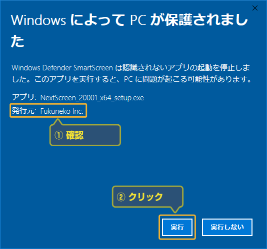 NextScreenは、コードサイニング証明書が新しいものに更新されることがあります。その場合、インストールを実行しようとする時に「WindowsによってPCが保護されました」という画面が表示され、インストールが中断されることがあります。この画面が表示されたときは、「詳細情報」をクリックし、その後に現れる「実行」ボタンをクリックしてください。